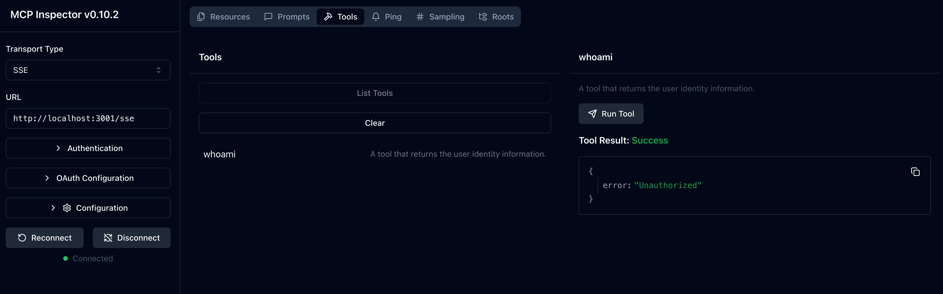 Now that we have the MCP server running, we can use the MCP inspector to see if the whoami tool is available.